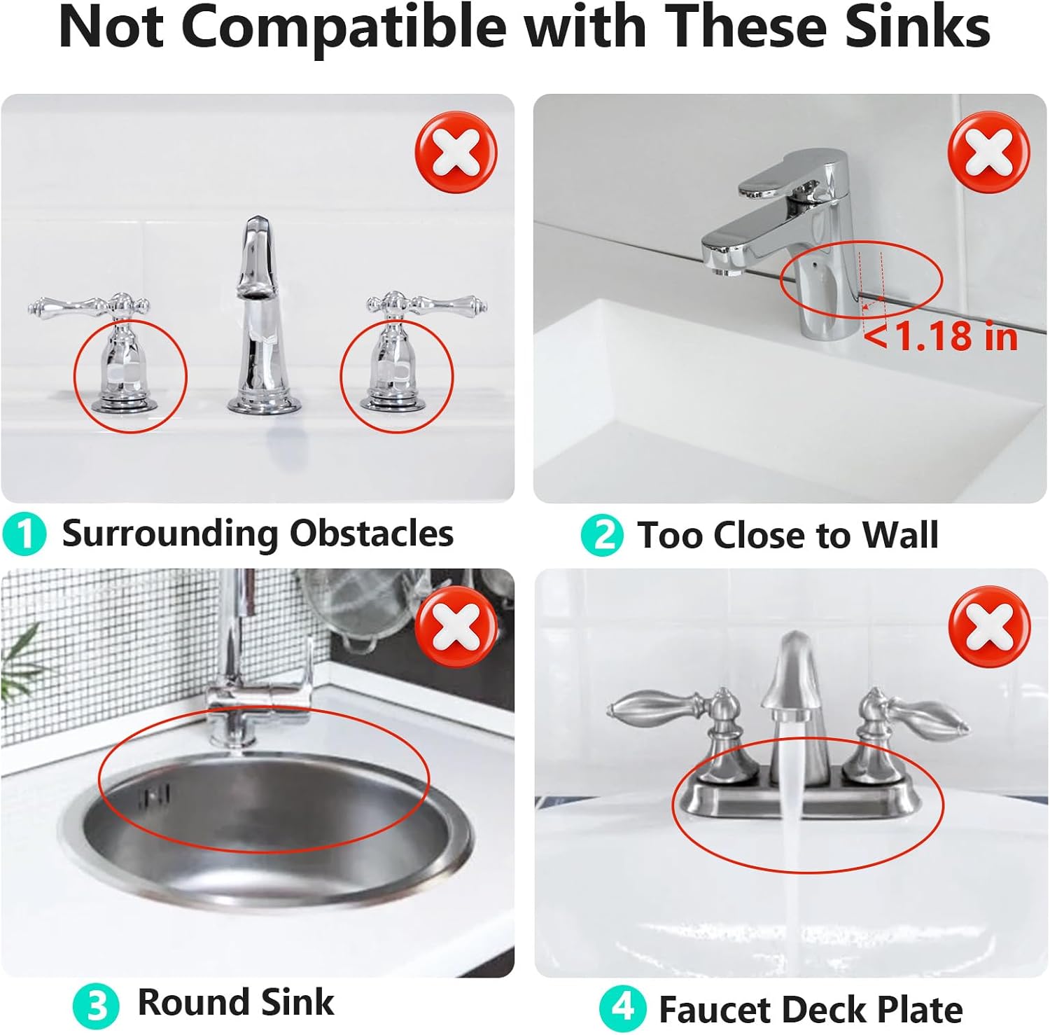 🚩【𝐅𝐮𝐥𝐥𝐲 𝐅𝐥𝐚𝐭 𝟐𝟒” 𝐱 𝟓.𝟓” 𝐀𝐫𝐞𝐚 𝐑𝐞𝐪𝐮𝐢𝐫𝐞𝐝】Please Keep a 𝟐𝟒” 𝐱 𝟓.𝟓” clear space around your faucet. free of built-in filters, or hand soap dispensers, unless you are willing to cut the mat to let it can be laid flat. If you need to cut, You can put a couple slash marks in the product back to go around the soap dispenser. It is simpler and keeping the water out. (But Cutting Requires Skill) So it’s best to ensure there are no obstacles, NOT Applicable for curved rims sink, side sink, round sink, thick faucet base.