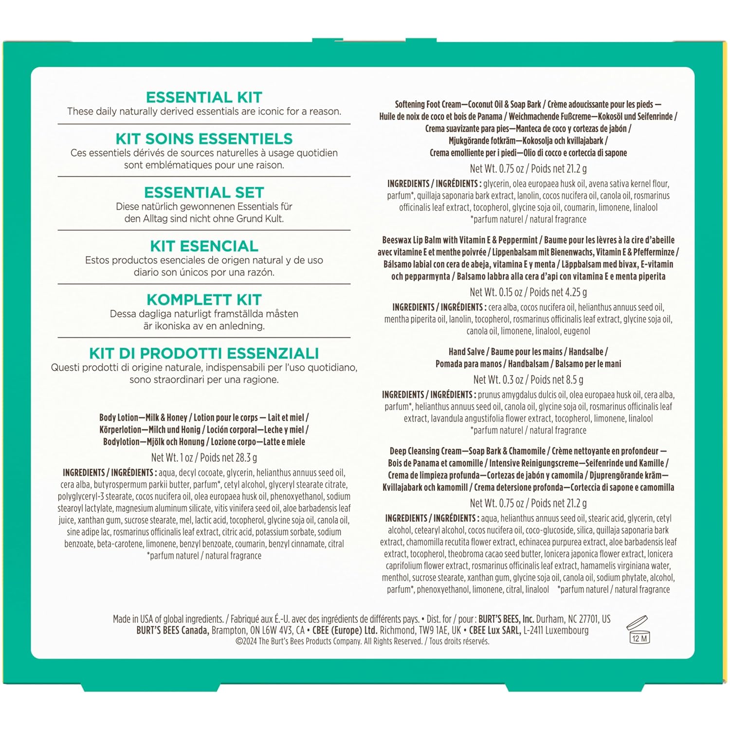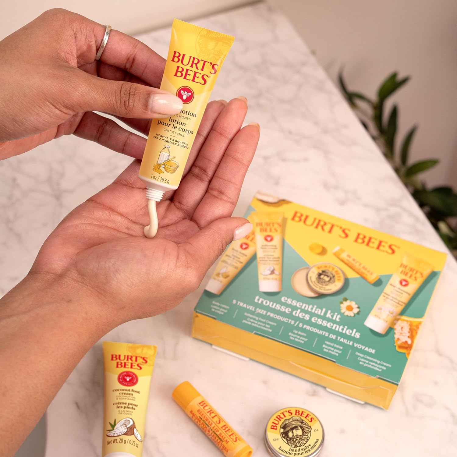 GIFT SET: One Burt’s Bees Essential Kit that includes five travel size skin care products, including Deep Cleansing Cream, Softening Foot Cream, Milk and Honey Body Lotion, Hand Salve and Beeswax Lip Balm