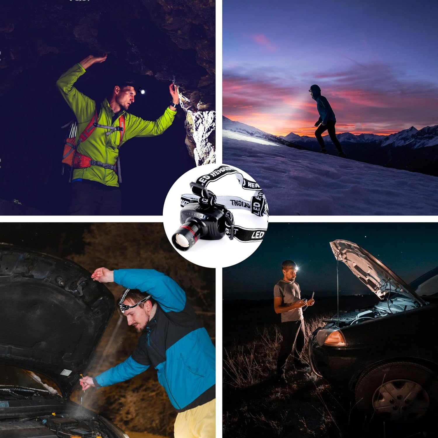 CONVENIENT AND PRACTICAL HEADLAMP:High/medium/flashing/, (Equipped with AAA model)It also features 90° adjustability and zoom for ease of use, allowing you to shine in any direction,The led headlamp is durable and it’s also waterproof, so you can use it in rain or snow, The front headlamp features an easy-to-adjust, highly elastic headband that ensures a comfortable fit for any size head.