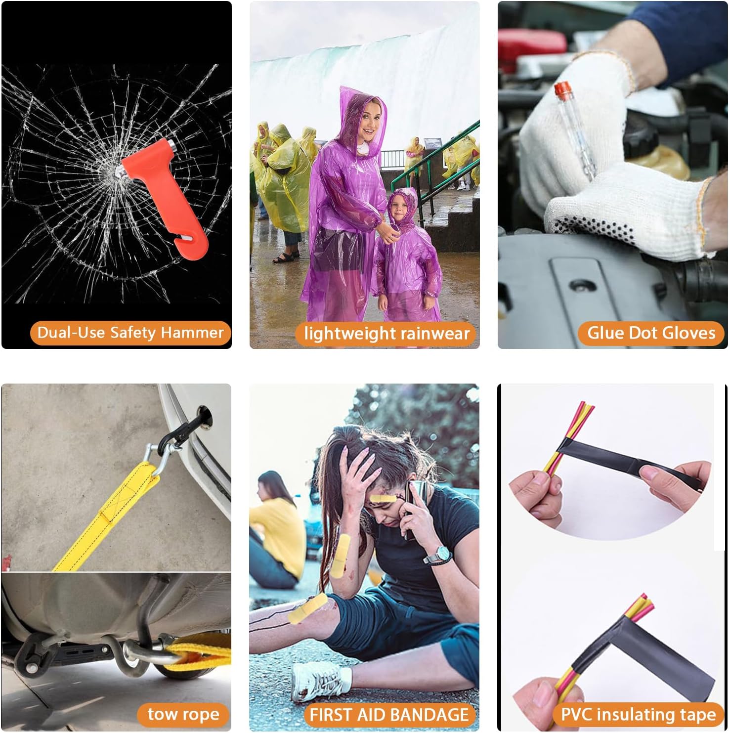 What’s in this package:From car jumper cables kit, rainwear, headlamps, and Dual-Use Safety Hammer,to tow ropes, non-slip gloves, band-aids, and PVC tape.