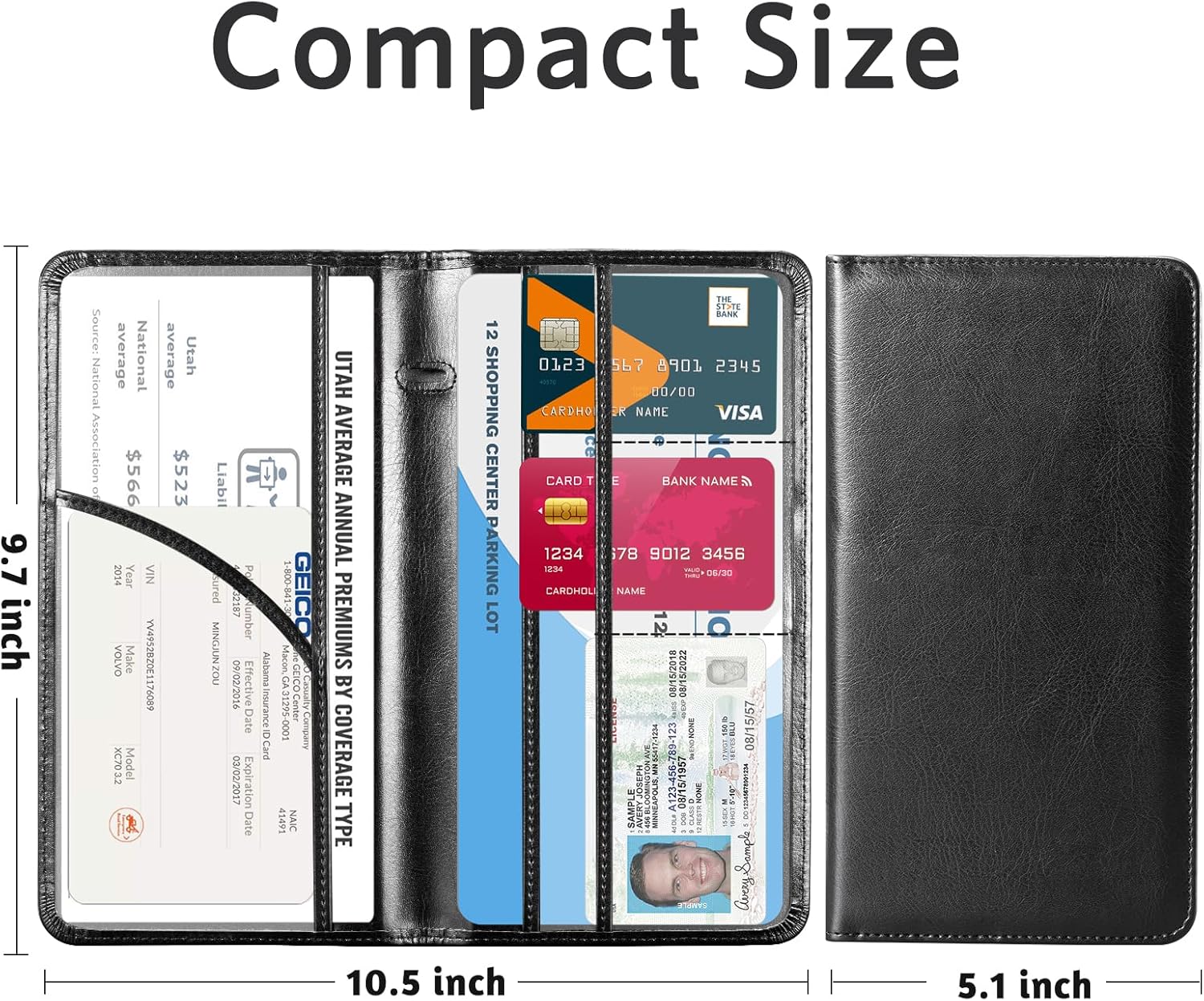 6 COMPARMENTS: Comes with 3 large pockets for insurance documents, vehicle registrations cards and other valueable information. And 3 small pocket for driver’s license, ID cards, business cards, key contact information cards.