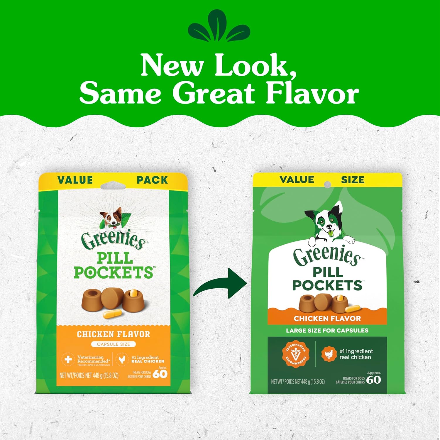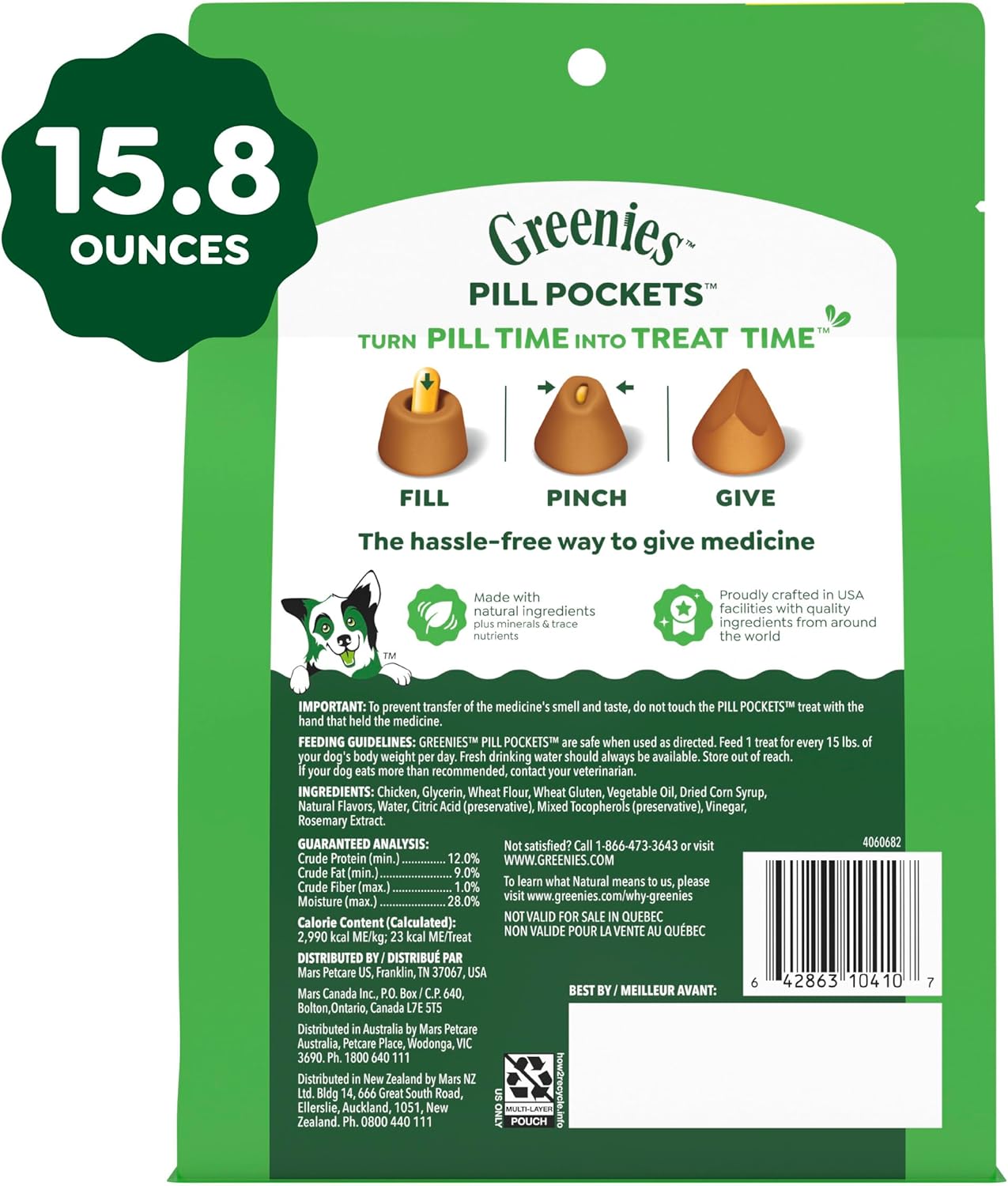 Greenies Pill Pockets turn pill time into treat time, they simplify pill giving. These pill pouches for dogs let dog parents and pet owners provide pill administration without messy peanut butter or cheese. Created by veterinarians, the healthy pouch, made with natural flavor masking ingredients plus trace nutrients, masks smell and taste so medication delivery stays stress-free in your daily medication routine at home. Suitable for large or small breeds to encourage voluntary ingestion, this capsule-size formula helps pet parents maintain health and dog wellness through easy medication administration while keeping paws clean. It reduces medication refusal, simply drop the tablet into the pouch, pinch, offer, and watch it vanish–administering medicine with this pill mask never felt so rewarding. Data on file at Mars Petcare US, Inc. 2018
