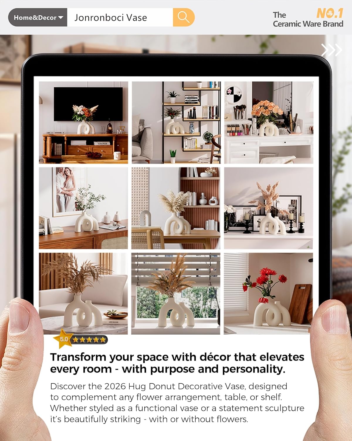 Donut – shaped vase adds visual interest. Bold design makes a strong first impression; neutral tones fit any color scheme.