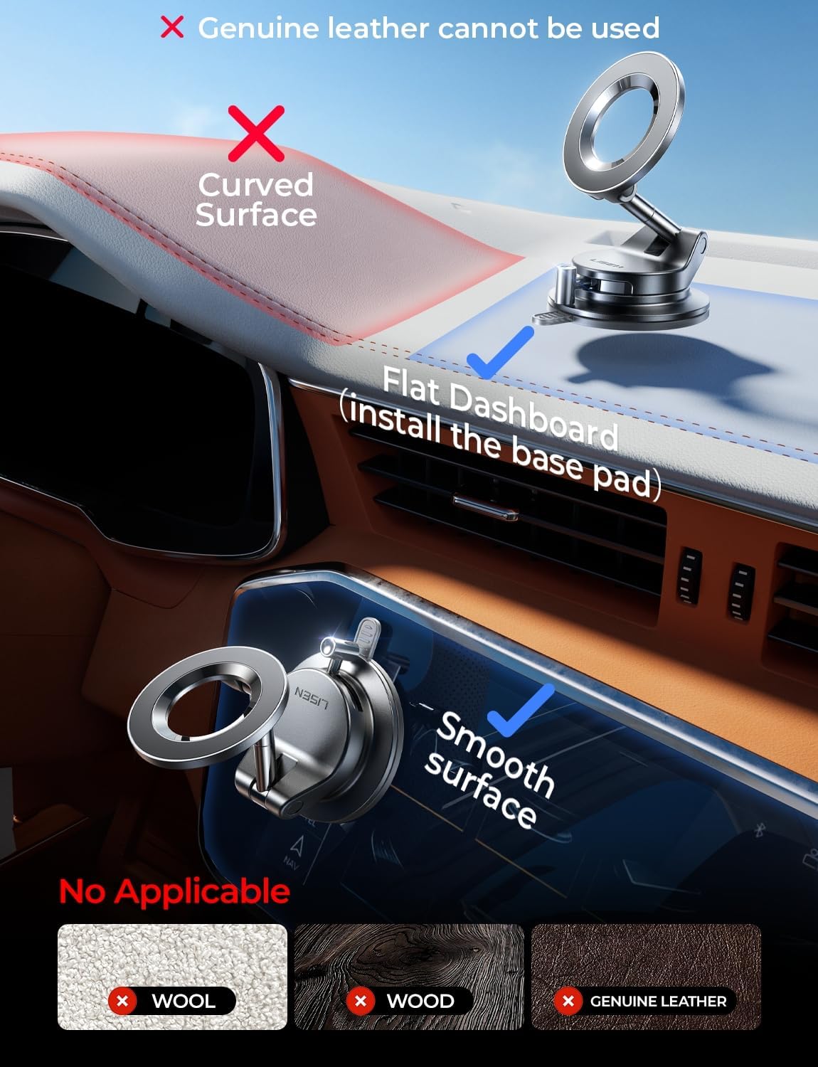 【Important Installation Information】: ①If this magsafe car mount detaches in high temperature conditions, simply reattach it to restore function. ② Do not use this magnetic car phone holder on surfaces with large particles, textures, or curves. ③ If the suction cup of this magnetic car phone holder loses stickiness, rinse with water and air dry (do not wipe with paper towels).