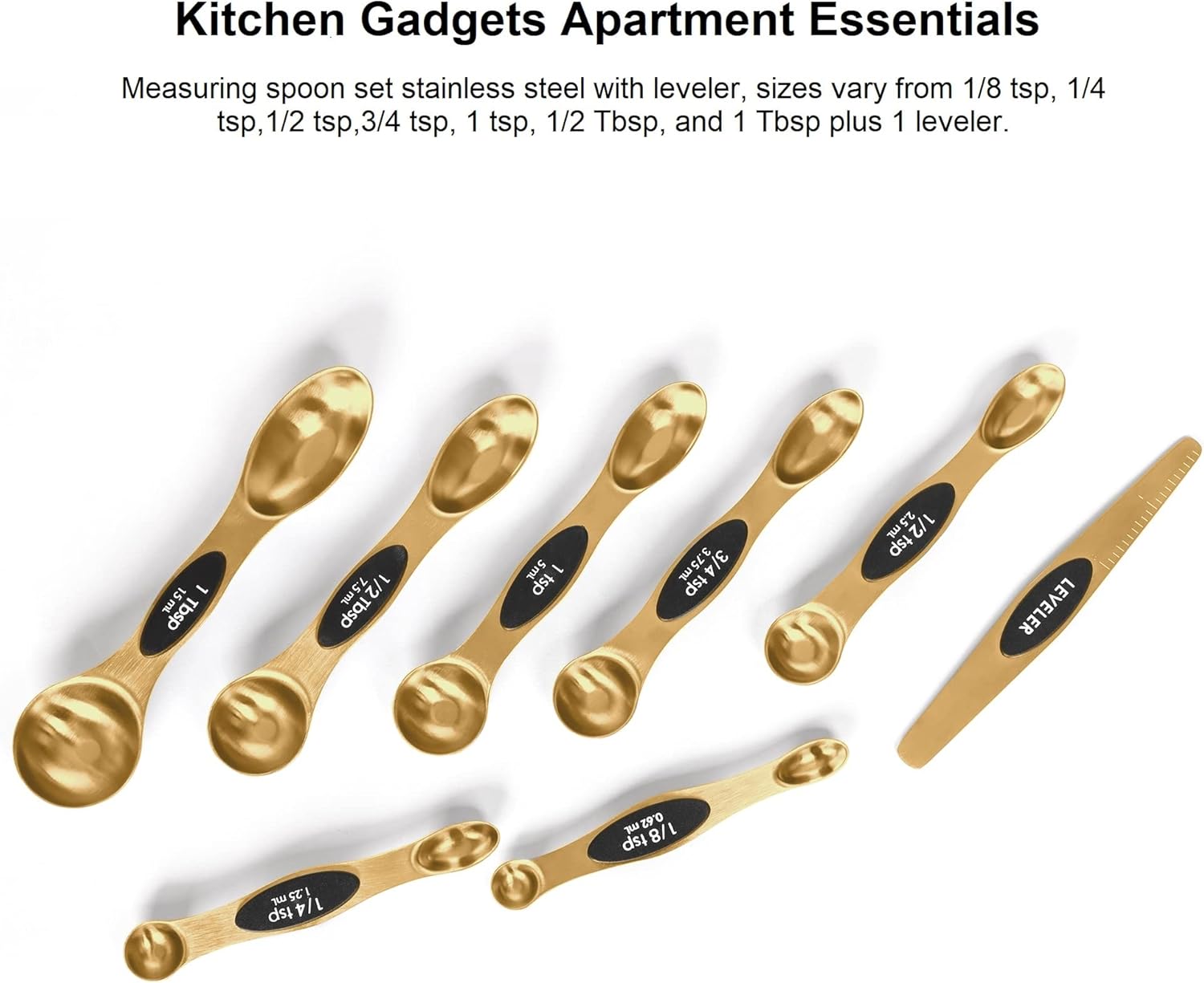 Accurate Measuring Spoons Set: Designed stainless steel double-headed spoons set and a leveler,black plastic label on the magnetic measuring spoons set stainless steel with clear usa standard measurement markings is useful for you to cook pastry food more accurately.This tables gadgets new apartment essentials spoons set is available in various sizes, includes 1/8 tsp, 1/4 tsp, 1/2 tsp, 3/4 tsp, 1 tsp, 1/2 Tbsp, 1 Tbsp plus and 1 leveler.