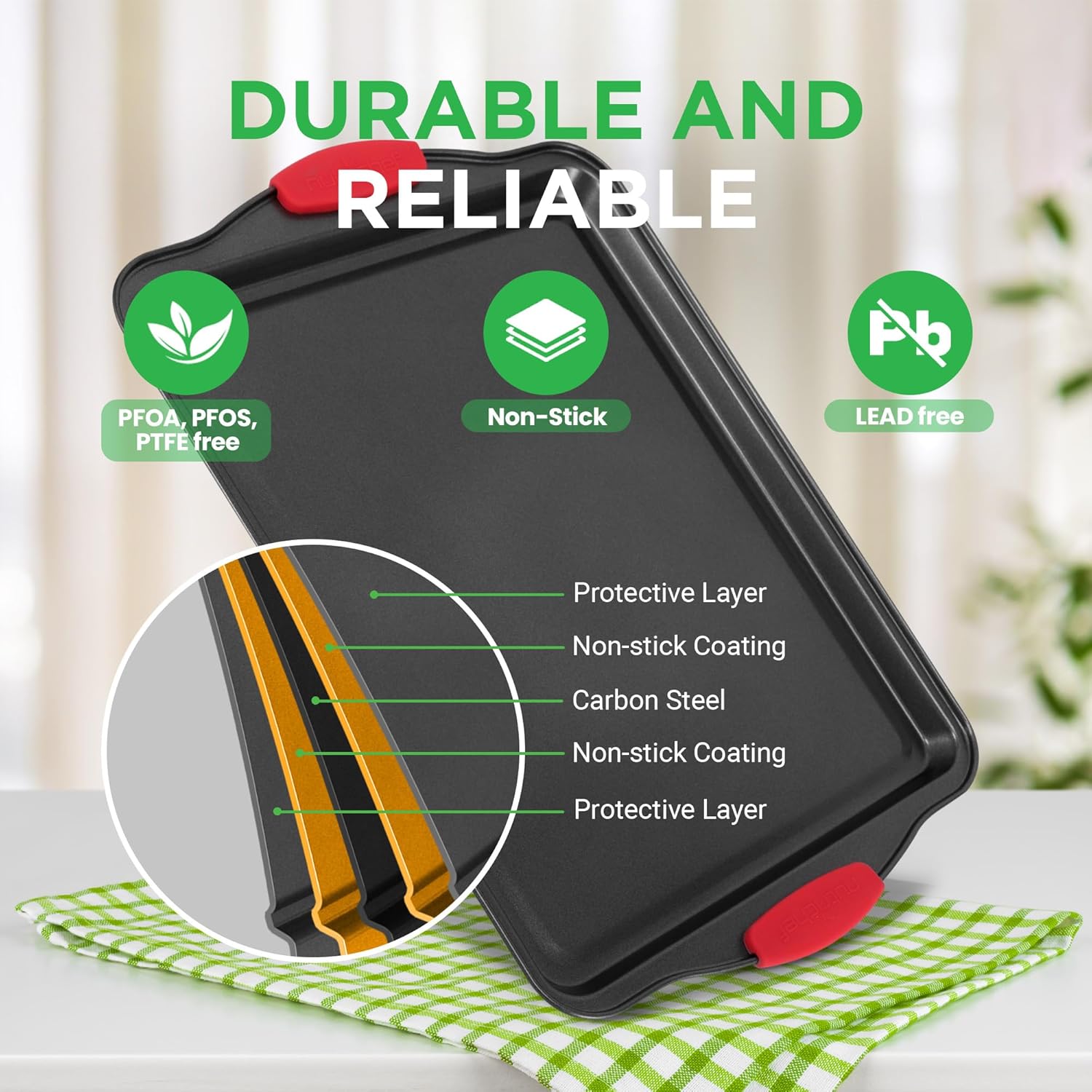3-PIECE SET: NutriChef 3-piece nonstick cookware set includes the small, medium, and large size of cookie pans. These are a flexible, stylish, and non-stick carbon steel bakeware set with red silicone handles