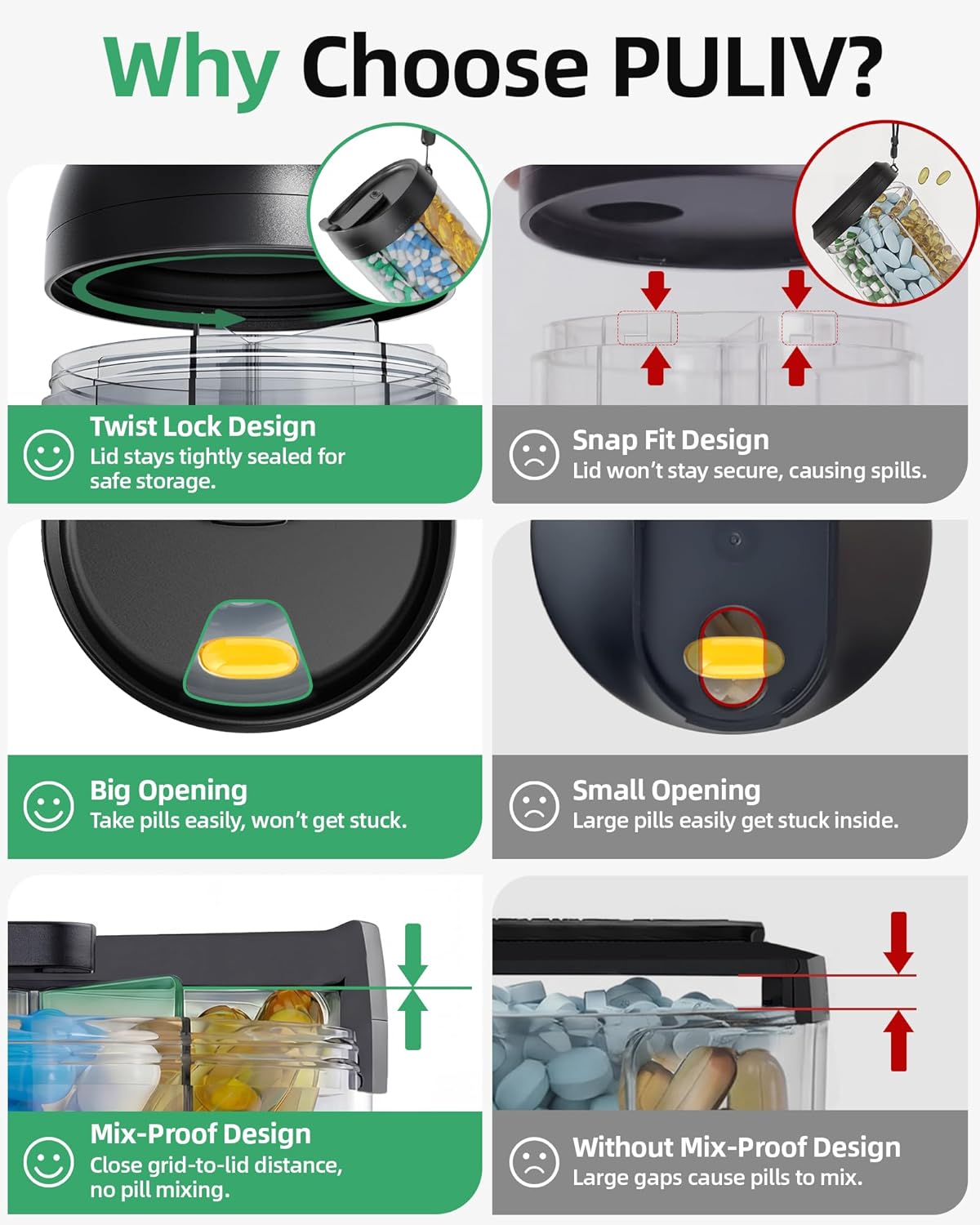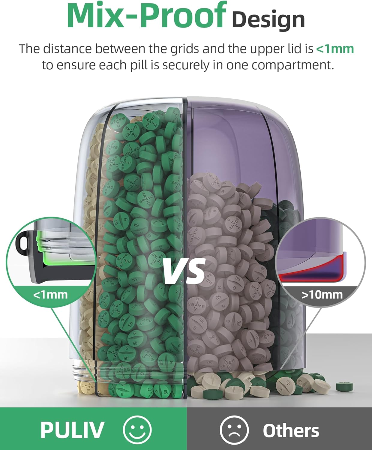 Say Goodbye to Mixing Pills: PULIV jumbo medication organizer with the design that the distance between the grids and the upper lid is close to ensure anti-mixing pills. Stop being troubled by pills mixing when pouring. Please note: This organizer is not suitable for storing gummy vitamins. For optimal use, store in a dry place and avoid direct sunlight exposure
