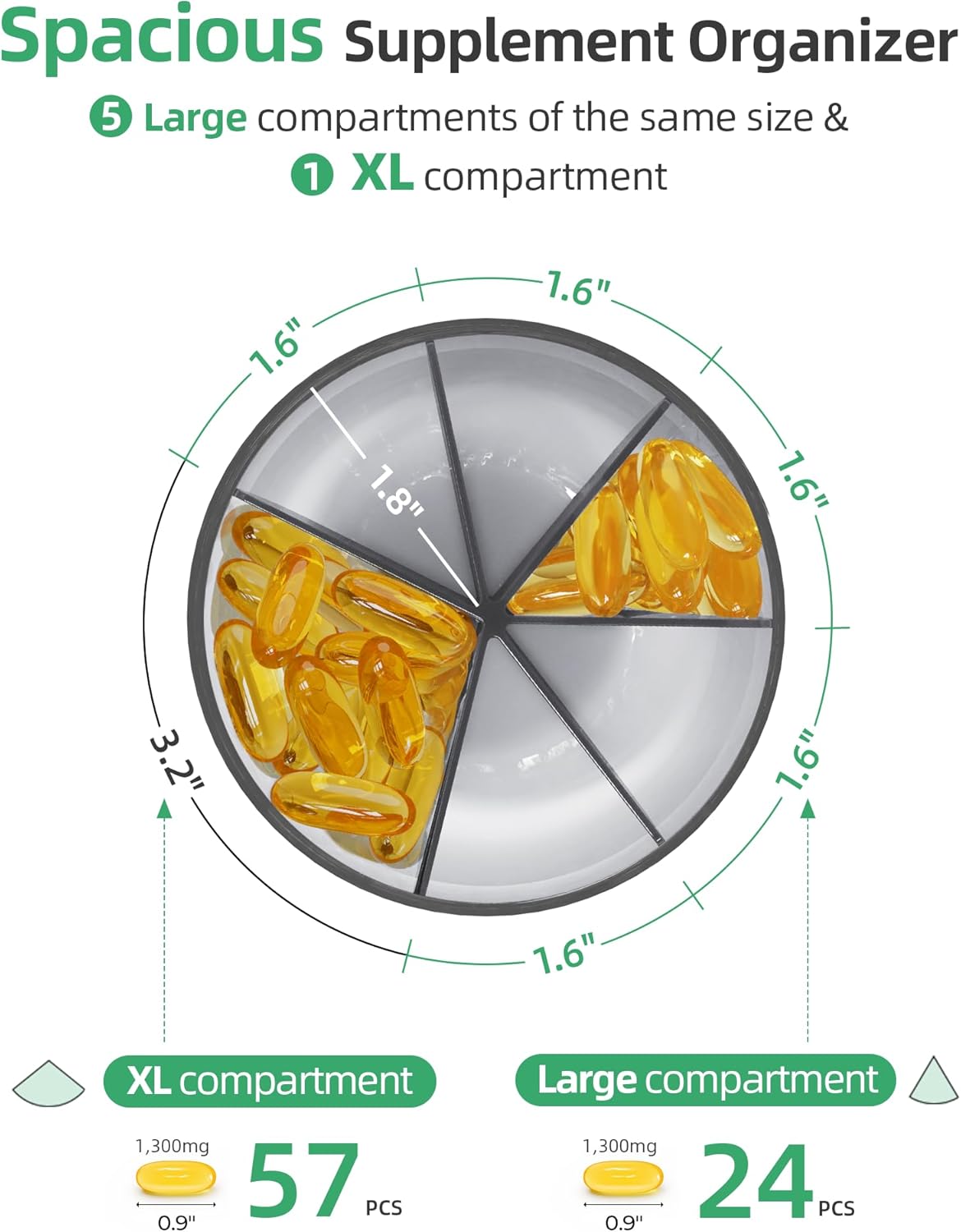 Large Compartments: The PULIV pill holder weighs 6.5 ounces and features 1 XL compartment and 5 large compartments. The XL compartment can hold up to 57 fish oils, with each fish oil measuring 0.9″ in length, while each of the large compartments can store 24 fish oils. This pill dispenser offers a convenient way to store 6 types of pills in one place. It has a height of 5.0″ with a lid diameter of 3.6″ and a base diameter of 3.0″. And 20 stick-on labels can help differentiate each compartment