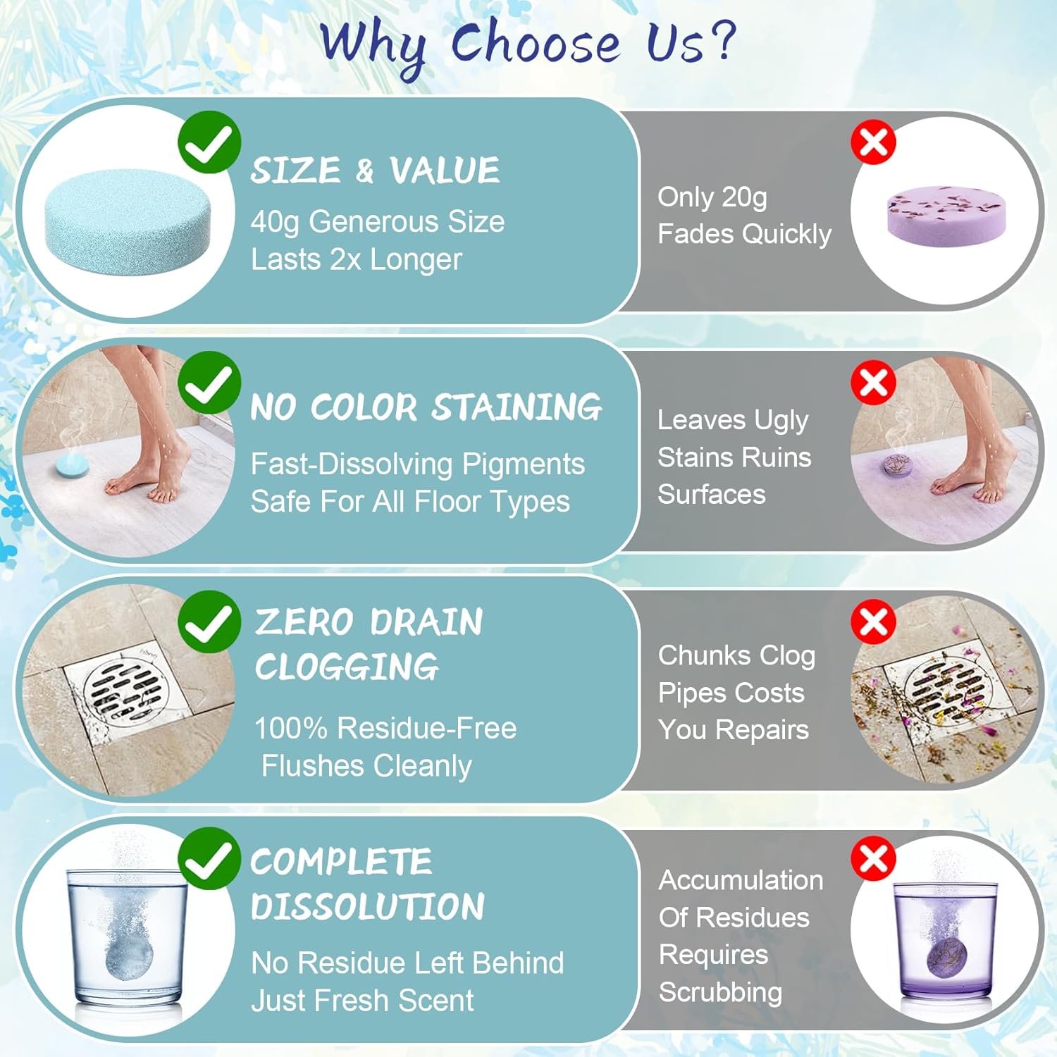 Enduring and Soothing Aroma: Our Shower Steamers are made with natural ingredients and plant essential oils,crafted without any chemical additives, ensuring they are non-irritating and hypoallergenic, making them suitable for all skin types. Through continuous upgrades and improvements, we have enhanced our shower steamers to emit a fresher, richer, and longer-lasting fragrance than others. Enjoy a shower that helps you relieve the stress and fatigue of the day