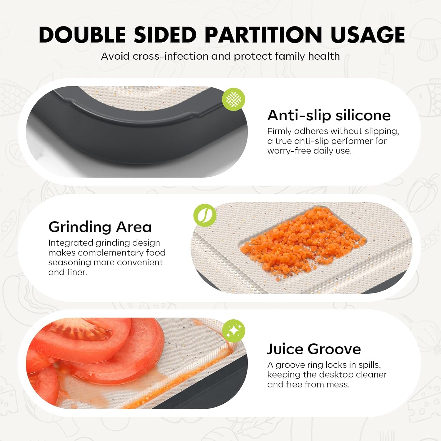 【Saving-Time Design】Built-in juice groove and garlic grinding area cutting board, deep groove that doesn’t spill liquids, can store 200ml liquid, and milling zone for garlic and ginger grinding saves time in your cooking.