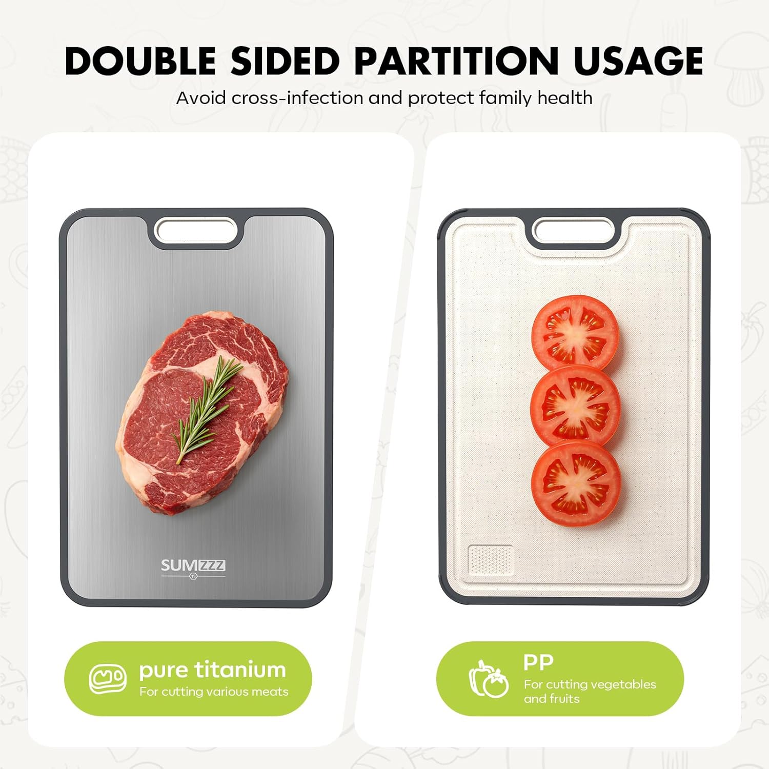 【2 IN 1 Cutting Board 】Cutting board is a versatile 2 in 1 kitchen tool, with one side made of food-grade 99.9%Pure Titanium for cutting raw and cooked meat, and the other side made of PP material for cutting vegetables and fruit.