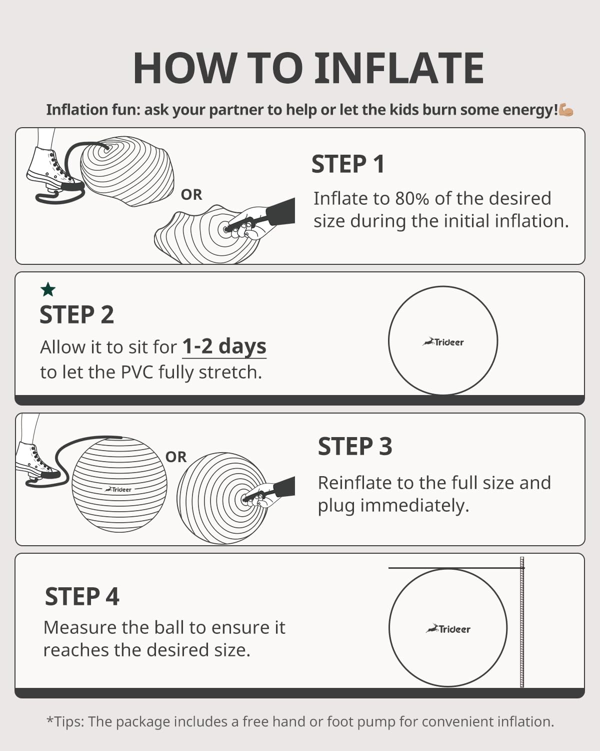 EASY INFLATION- Trideer exercise ball comes with a quick inflation pump (45/55/65cm equipped with a hand pump; 75/85cm equipped with a foot pump), 2 air stoppers, and detailed instructions; available in 5 sizes to meet all your needs.