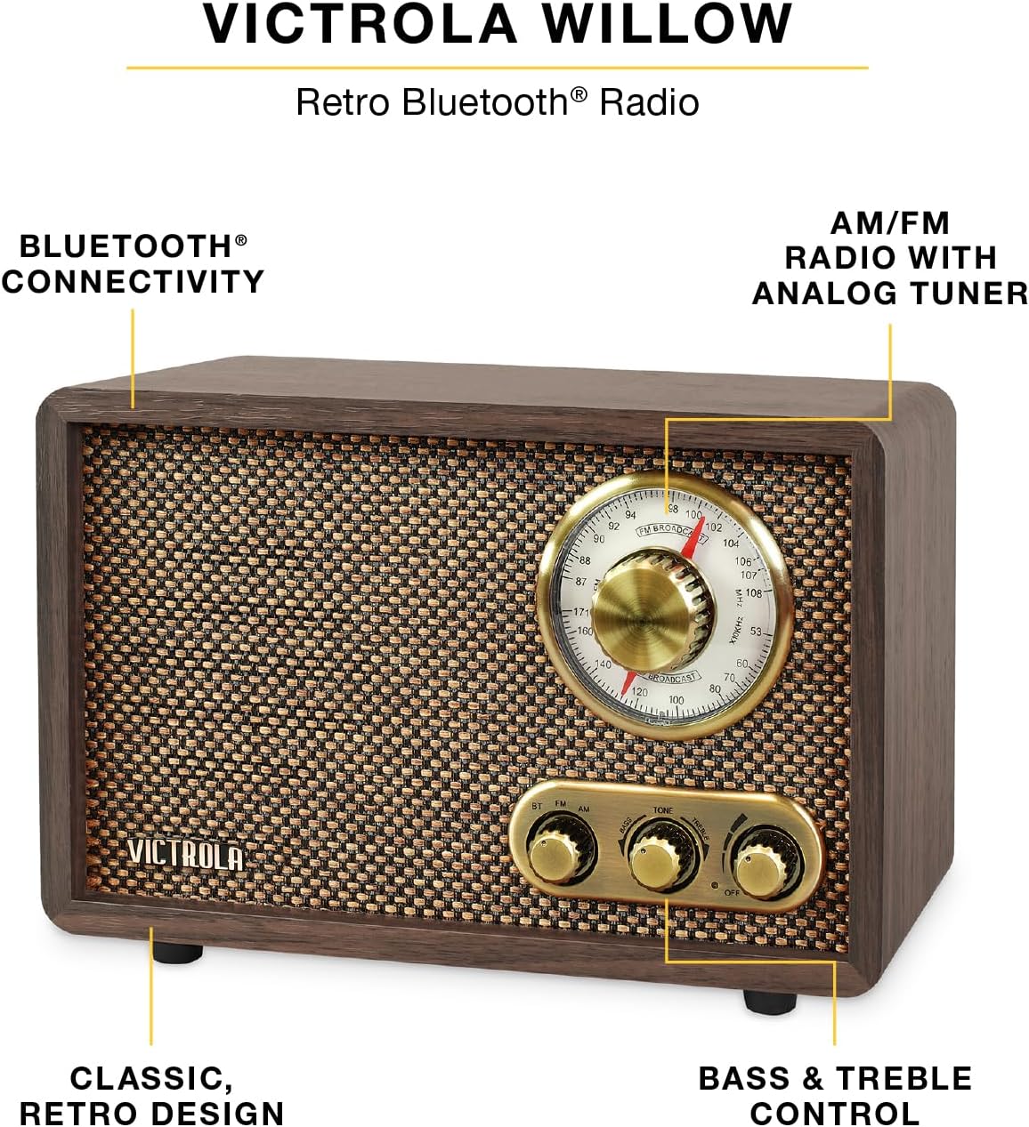 ALL THE CONTROLS YOU NEED – Features a volume knob that doubles as the power button, an AM/FM tuner to navigate through stations, and a bass & treble knob to customize your listening experience. The knobs have a nice feel to them and a trendy antique vibe