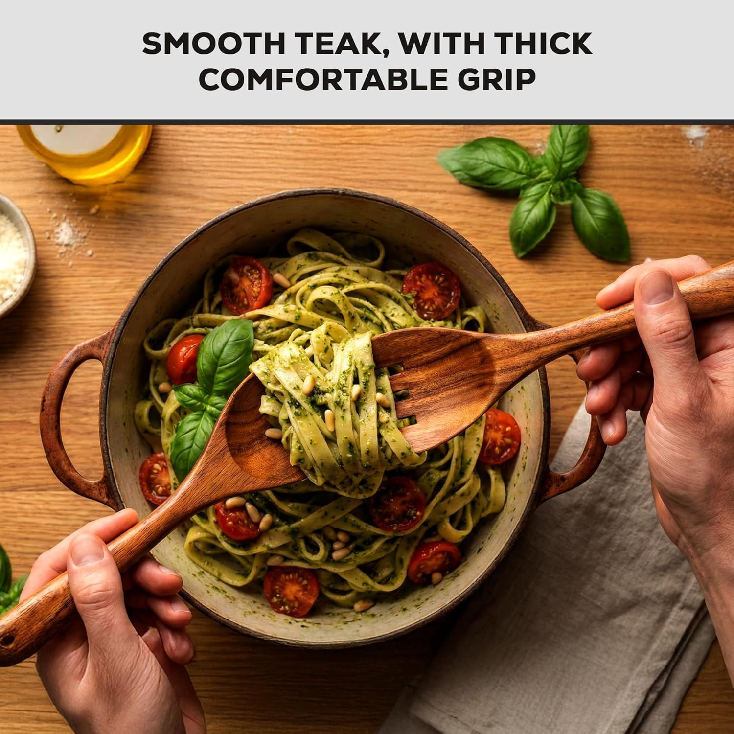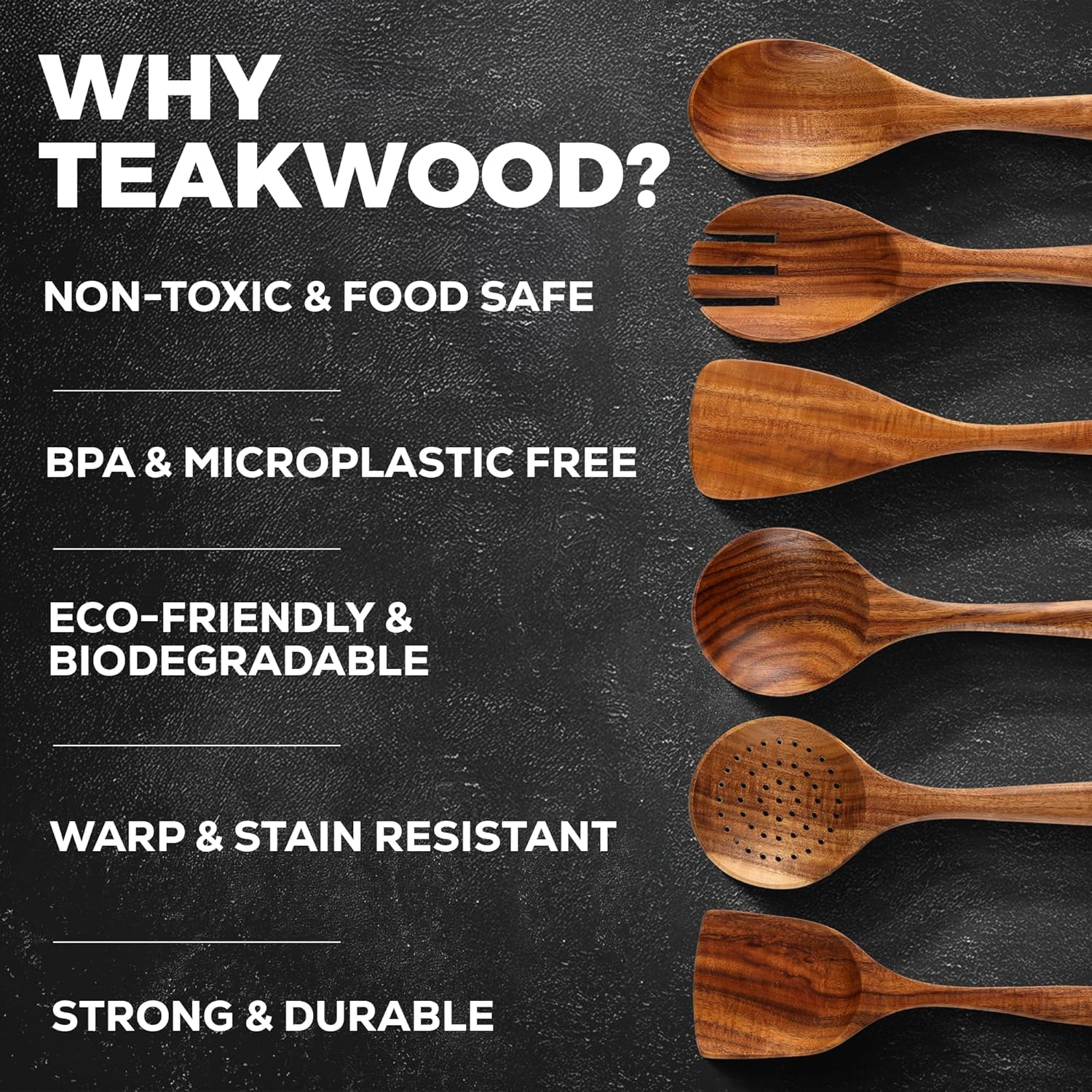 SCRATCH-FREE DESIGN: Our Wooden Cooking Utensil Set is made of Premium Quality Teak Wood close-grained hardwood with high organic oil, and silica content that is known for being one of the hardest, strongest, and most durable of all timbers. Beautifully crafted, soft to touch, lightweight, and very solid basically defines these Wooden Spoon Sets for Cooking. Now you can use your precious non-stick cookware without worrying about damages and scratches.